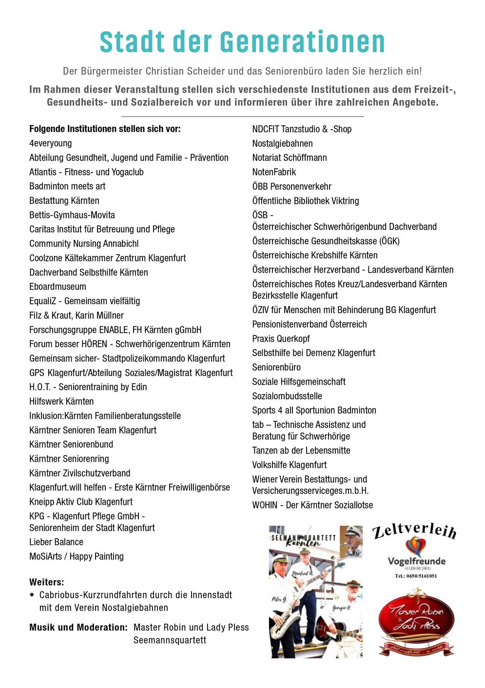 Besuchen Sie uns am 26. September 2024, 9 bis 14 Uhr, am Neuer Platz in Klagenfurt zur Veranstaltung „Stadt der Generationen“.