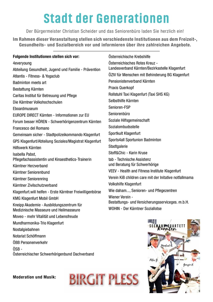 Besuchen Sie uns am 25. September 2025, 9 bis 14 Uhr, am Neuer Platz in Klagenfurt zur Veranstaltung „Stadt der Generationen“.