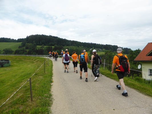 Teilgenommen haben 18 Personen aus ganz Kärnten und zwei aus der Steiermark. Die Hälfte davon ist mit dem Zug (S-Bahn) von Klagenfurt nach Granitztal angereist und die anderen mit dem Auto. Wir alle haben uns beim Parkplatz am Bahnhof Granitztal getroffen. Von dort aus starteten wir den St. Pauler Mostwanderweg Variante 3 (ca. 6,6 km und 200 Höhenmetern), der uns durch eine wunderschöne Landschaft führte, die von Landwirtschaft und vielen Streuobstbäumen geprägt ist.