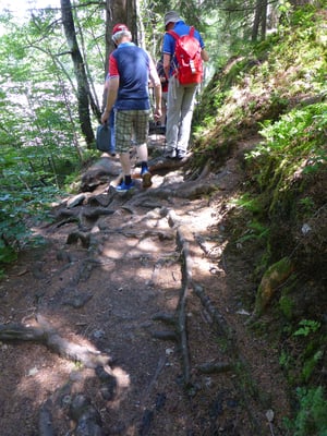Weiter ging es über den schmal angelegten Pfad durch den Wald. Ständig, fast bei jedem 2. Schritt, musste man über Baumwurzeln sowie auf der halben See-Südseite teils über rutschige unregelmäßig hohe Felsen-Stufen steigen. Dabei ging es mehrfach ungesichert mehrere Meter abschüssig in die Tiefe.