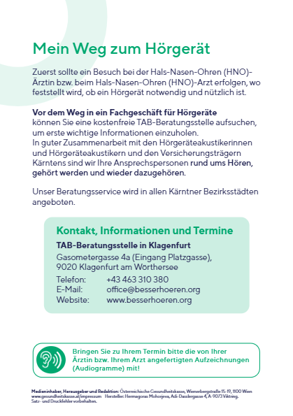 können Sie die kostenfreie TAB-Beratungsstelle des Forum besser HÖREN aufsuchen, um erste wichtige Informationen einzuholen. In guter Zusammenarbeit mit den Hörgeräteakustikern und den Versicherungsträgern Kärntens sind wir Ihre Ansprechpersonen.